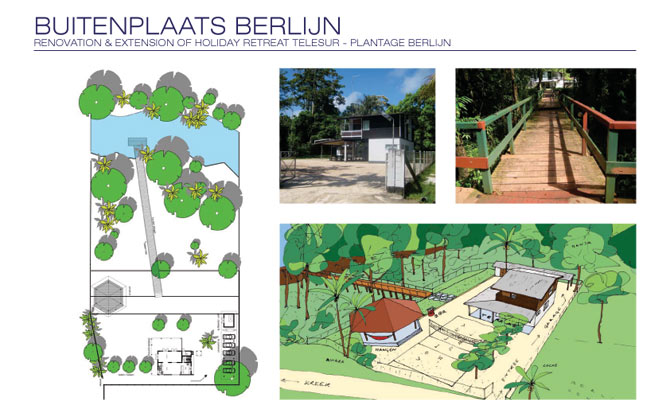 A Bruynzeel wooden prefab house from the seventies set in the lush vegetation of former plantation Berlijn acts as a holiday retreat for Telesur directors. Used mostly to enjoy the lovely surroundings, but also to have formal and informal meetings with staff and clients. Renovation and extension is due in order to meet with modern requirements. Among many small improvements a new wooden hammock camp on the edge of the woods and swamp is to be erected in order to provide necessary shaded and dry relaxation space.