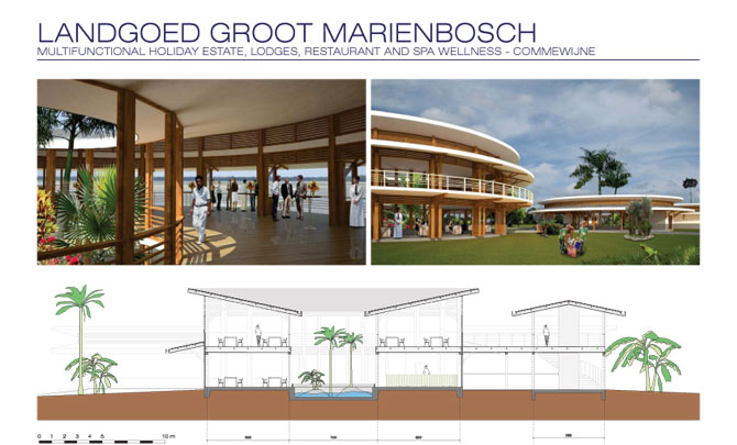 Ambitious plan to establish a multifunctional tourism estate on former fruit and coffee plantation Mariënbosch, located between the north bank of the Commewijne River and the Atlantic Ocean. The programme includes: wellness centre, 80 room hotel, conference centre, restaurant, private lodges, pool, coffee experience museum and renovation of the old planta-tion mansion.Driving concept for wellness, restaurant and lodges, set on the banks of the river, was a system of overlapping circles to create an intricate spatial quality between the different programme elements.The hotel en conference facility honour the rectangular grid of the plantation.