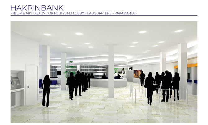 New information counter in the lobby to improve all customer services. Part of a larger scheme to re-accomodate all customer services on the ground floor of the bank.