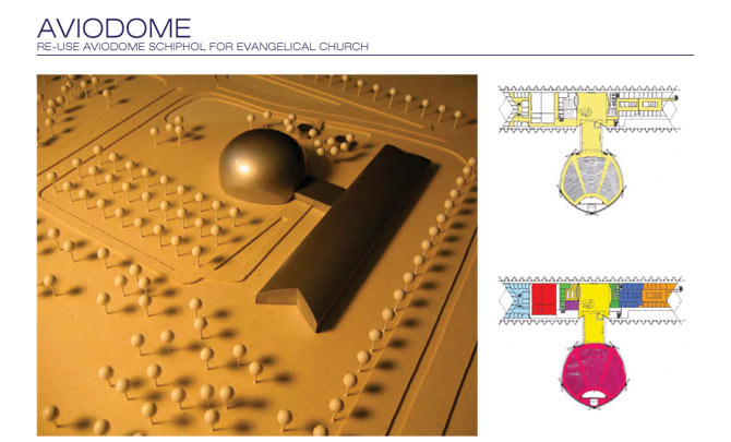 Design for re-use of Aviodome for an Evangelical Church. Buckminster Fuller’s Geodome was built in 1970 for the Museum of Aviation at Schiphol Airport. In 2005 the dome was to be demolished, when a young and fast growing church community (Levend Evangelie Gemeente) came up with the idea to buy and re-use the structure. It was deconstructed and packed to become the main church hall as part of a greater complex where bible school, guesthouse and conference facilities will arise in a new structure.