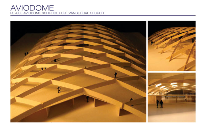 Design for re-use of Aviodome for an Evangelical Church. Buckminster Fuller’s Geodome was built in 1970 for the Museum of Aviation at Schiphol Airport. In 2005 the dome was to be demolished, when a young and fast growing church community (Levend Evangelie Gemeente) came up with the idea to buy and re-use the structure. It was deconstructed and packed to become the main church hall as part of a greater complex where bible school, guesthouse and conference facilities will arise in a new structure.