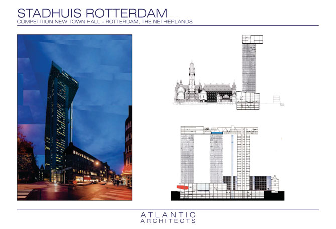 The new town hall, set on a limited plot, is composed of three office towers and topped with a public area and wedding platform.